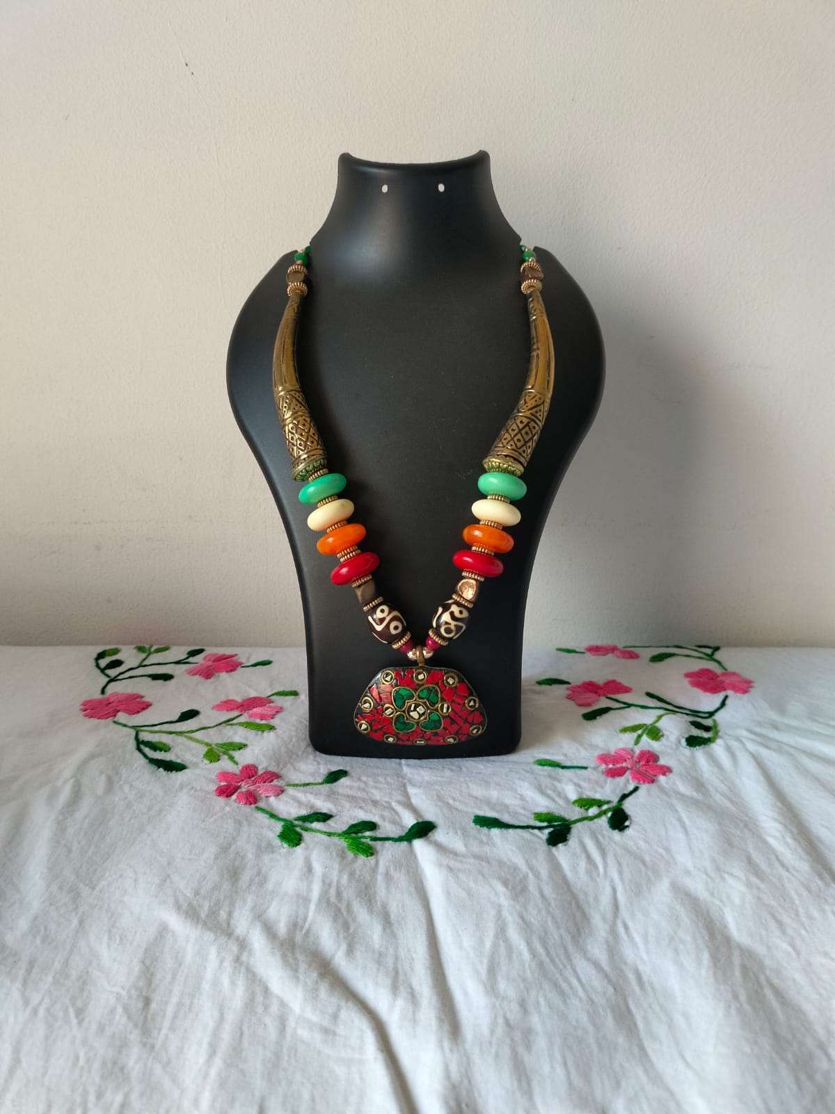 Elevate your ethnic ensemble to royal heights with this masterpiece of handcrafted jewelry. The necklace features a majestic trapezoidal pendant adorned with intricate red and green mosaic stone work. The highlight of this piece is the pair of carved antique brass horn-shaped accents that form the upper part of the necklace, exuding a tribal-warrior charm. It is further embellished with a vibrant sequence of emerald green, cream, orange, and ruby red beads, making it a celebration of traditional colors and textures